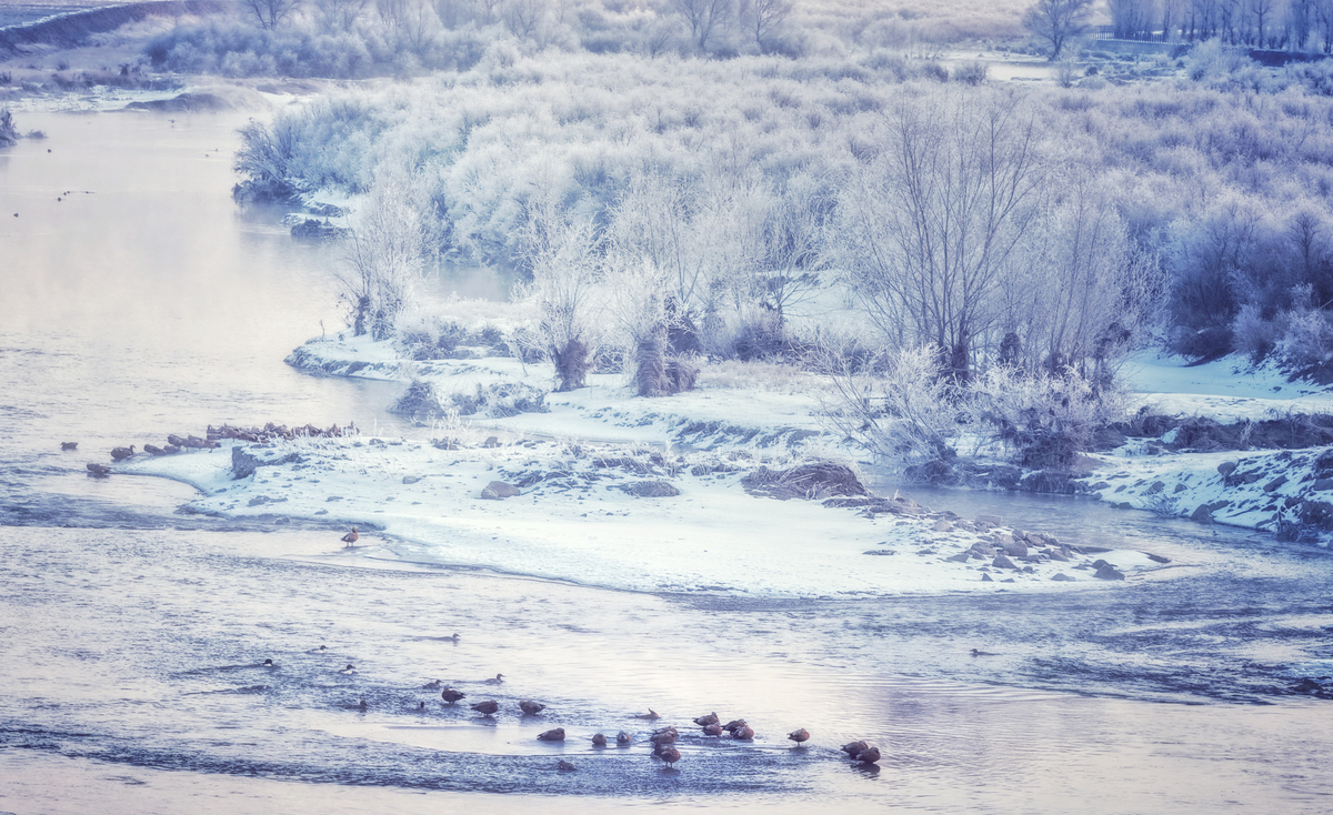 雾凇镶金边 鸥鸟戏水间