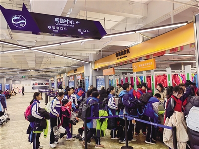 进入雪场大厅,迎面是滑雪场总服务台和滑雪学校服务区,游客可往左侧一排收银窗口咨询购票。购买雪票领取滑雪卡后,依次到雪鞋租赁区、雪服租赁区和雪板租赁区领取并穿戴好装备,便可刷卡进入滑雪区域。对于线上购票的游客,雪场还提供自助取(退)票服务。