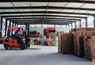 图为灵丘县中源物流仓储基地工人正在仓库中快速中转快递。