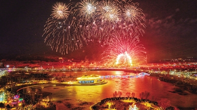 3日晚,云州区第三届“火山璀璨之夜”烟花秀与万人祈福旺火活动精彩上演。璀璨烟花点亮城市体育公园夜空,熊熊旺火吸引市民游客祈福打卡,沉浸式体验塞上云州浓郁年味。