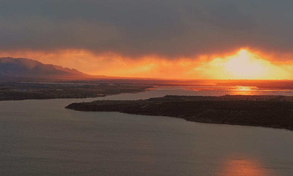 24日,我市受冷空气侵袭,高空冷暖空气交汇碰撞,气流剧烈波动产生艳丽晚霞奇观。在册田水库上空,橙红霞光穿透层层冷云倾泻而下,暖调霞光与冷色云团形成鲜明对比,与澄澈湖面、远山堤坝相映成趣,宛如绝美画卷。