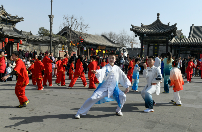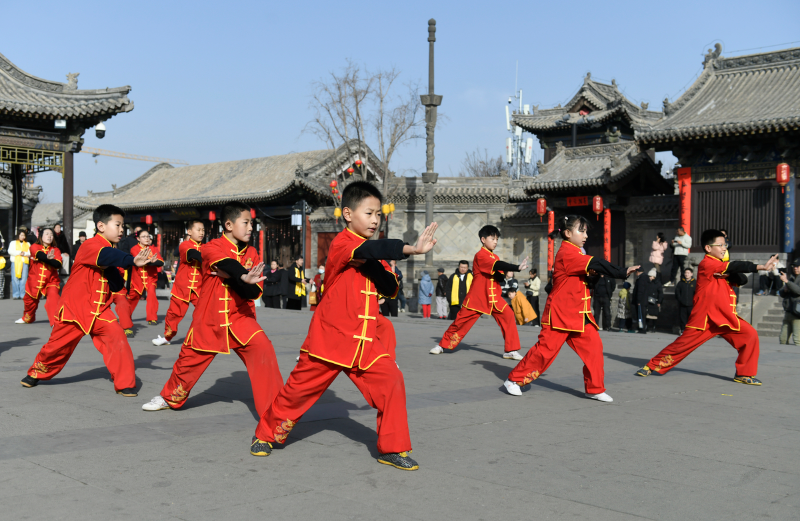 为弘扬传统武术文化、丰富市民精神生活,25日,大同市塞外梅花拳协会会员在关帝庙广场举办武术表演活动,向过往市民和游客展示梅花拳套路、器械、对练等传统武术项目,全面呈现非物质文化遗产的独特魅力。图为协会会员为市民、游客展示梅花拳套路。