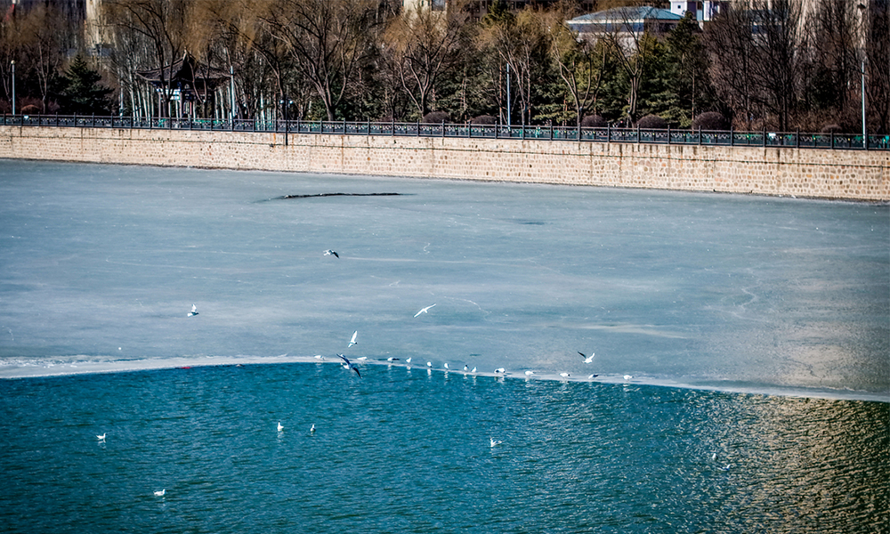 连日来,成群结队的银鸥现身御河生态园,为初春的河畔增添了灵动的气息。3月17日上午,记者在北都桥与兴云桥之间水域看到,水面大部分仍覆盖着薄冰,只有橡胶坝附近的冰面渐融,数十只银鸥或在冰上休憩,或潜入水中觅食,或低空掠过水面,清脆鸣叫声此起彼伏。在蓝天碧水的映衬下,这些银鸥宛如跃动的白色精灵,吸引不少市民驻足观赏、拍照记录。