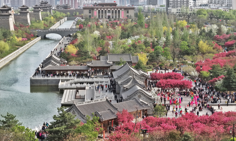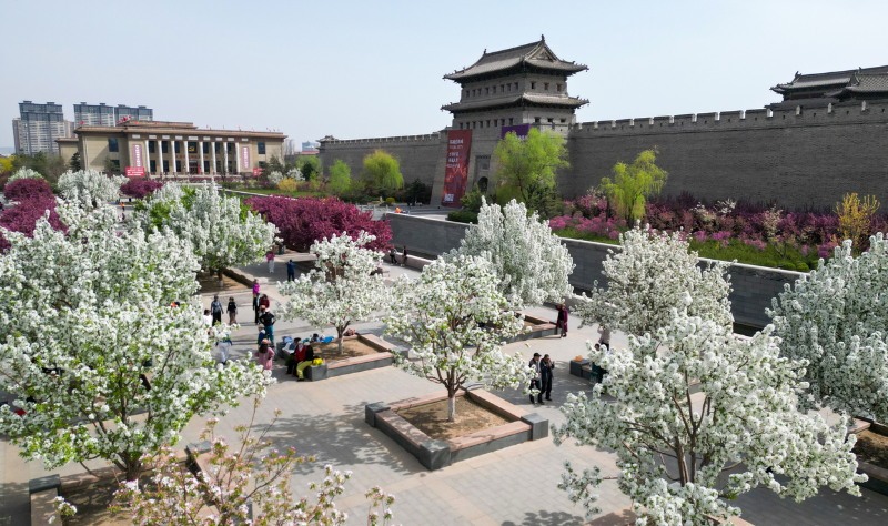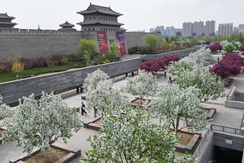 作为古城标志性的海棠观赏地,西城墙带状公园栽植了八棱海棠、亚当海棠、西府海棠等多个优质品种。每年四月下旬,各类海棠次第绽放,白瓣如雪、粉蕊似霞,层层叠叠缀满枝头。古朴厚重的古城墙、碧波荡漾的护城河与烂漫花海交相辉映,勾勒出一幅独具古都风韵的春日画卷。