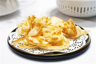 昝伟忠还向记者推荐了在“红旗”卖了30年的千层饼。面案师傅沿用传统的古法工艺将饼胚做好放在大盘里。有客人下单时,拿出饼胚,轻轻擀开,放入饼铛中烙制。烙好的饼看上去平平无奇,可在师傅手里“轻团”几下便展现出“千层”的样貌:每层面皮薄如蝉翼、层次分明,像一朵朵盛开的花儿,令人称奇。