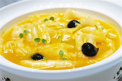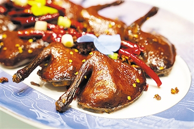 招牌乳鸽腿。选用8日龄乳鸽,每日从广州养殖基地空运而至。此时乳鸽肉质恰好达到嫩度与风味的黄金平衡点。此菜品采用“先卤后煎”的烹饪方法,以陈皮、野生菌菇熬制的卤汁香气渗入乳鸽肌理,煎制后外皮呈琥珀色,润泽鲜亮。咬开的瞬间,外皮酥脆,麻香四溢,彻底颠覆人们对乳鸽的传统认知,开创全新的味觉体验。