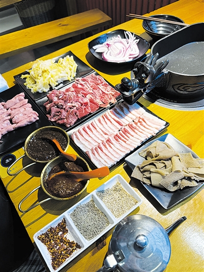 太子锅的烹饪方式也别具一格。食客们围坐在锅的四周,有专人现场在锅内烹炒食材。这种即炒即食的方式,让热辣的锅气瞬间激发食材的香味,带来奇妙的味觉快感。在食材选择上,太子锅可谓是海纳百川,肉类有牛上脑、猪五花、肥牛、鸡肉等供食客挑选。牛上脑经过排酸处理,口感细腻、味道鲜美;猪五花肥瘦相间,在锅中煎制时滋滋冒油,香气四溢。配菜里,茼蒿、酸菜和洋葱是必点项。茼蒿的清香、酸菜的酸爽、洋葱的清甜,与肉类搭配相得益彰。