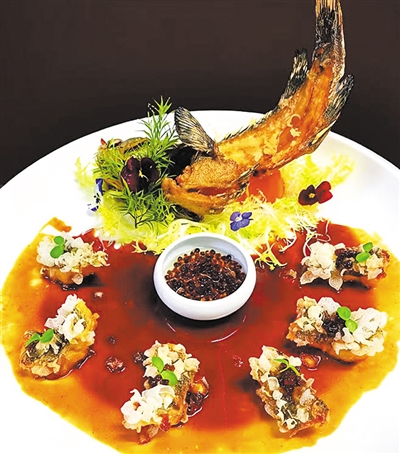 李淑的参赛菜品为金米牛肉粒和醋鱼子麒麟鱼。金米牛肉粒,牛肉粒裹上脆炸小米,然后码成整齐的条状。牛肉咬开外脆里嫩,小米酥脆,是创意中餐“传统菜现代解构”的典型呈现。醋鱼子麒麟鱼,以炸制鱼骨为视觉核心,分切鱼肉块环绕,搭配大同当地手工醋制作的醋鱼子和秘制酱汁,味道咸鲜、微酸,有浓郁的葱香味。这两道菜品既有丰富的口感层次,又凸显食材本味。同时,李淑的摆盘尽显精致,让评委清晰地看到晋菜“粗中有细”的独特魅力。最终,他的作品凭借对细节的极致追求获得金奖