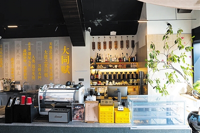 拾级而上,店门前一小片开阔之处摆放着桌椅。灰色砖墙上红色的“大同”二字格外显眼。细看“大同”二字,笔画中写满大同方言:圪蹴、家巴雀儿、眼泪爬擦、光眉处眼等十分有趣。推门而入,店内环境清新自然,颇具禅意。