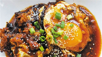 将煎蛋放回锅中,倒入调好的灵魂酱汁,转小火盖锅盖焖30秒~1分钟,让鸡蛋充分吸汁。