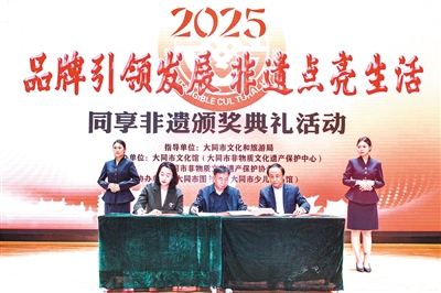 在本次颁奖典礼上获得授牌和荣誉称号的非遗智库专家、优秀非遗传承人、非遗守护人与小小宣讲员以及现场嘉宾、观众,还共同听取了《2025年非遗工作总结》报告。特别引人注目的是那些身着传统服装、肩挎红色绶带的小小非遗宣讲员,他们用稚嫩却坚定的声音朗诵《非遗里的大同》,让人们看到了传承的希望。而“非遗守护人招募计划”的发布,更标志着非遗保护从专业领域走向社会共建的新阶段。颁奖典礼上进行的多部门、多机构战略合作联盟签约仪式,则不仅是机构的合作,更是非遗融入现代生活的创新尝试。